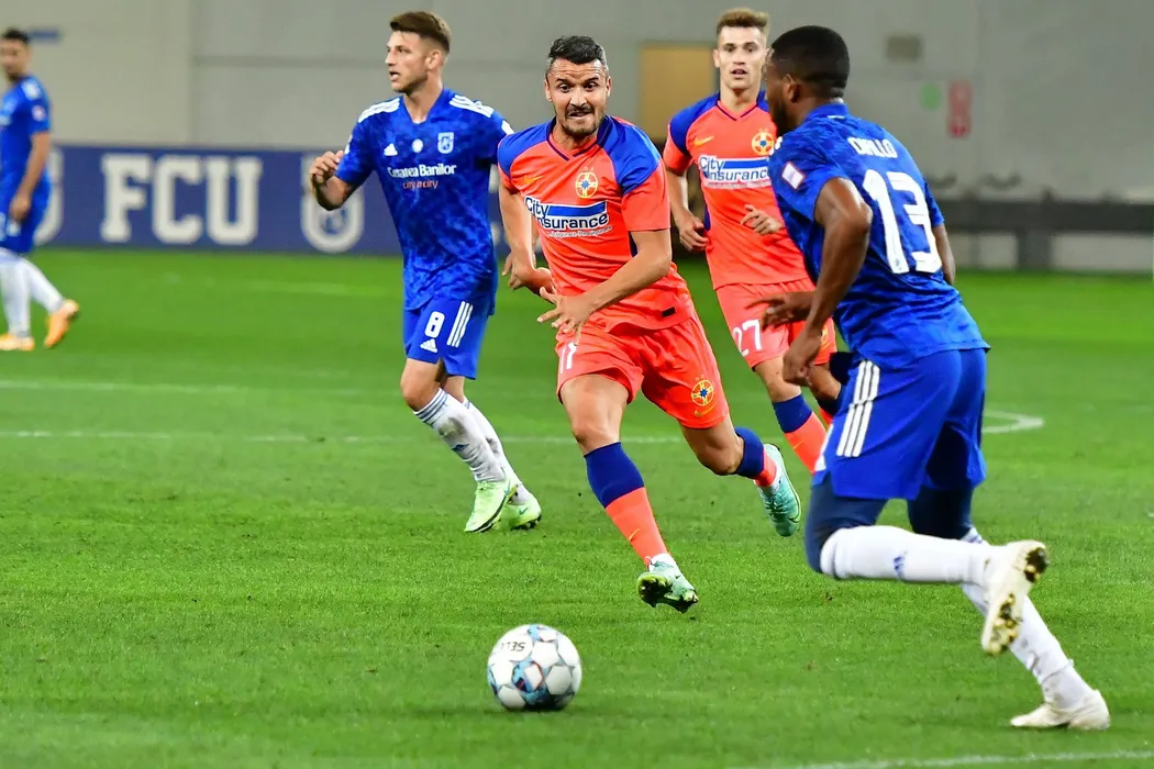 Constantin Budescu (C), de la FCSB, lupta pentru balon cu Bradley Diallo (D), de la FC Universitatea 1948, in meciul de fotbal din etapa a IX-a a Ligii 1, disputat in Craiova, sambata, 18 septembrie 2021. REMUS BADEA / MEDIAFAX FOTO