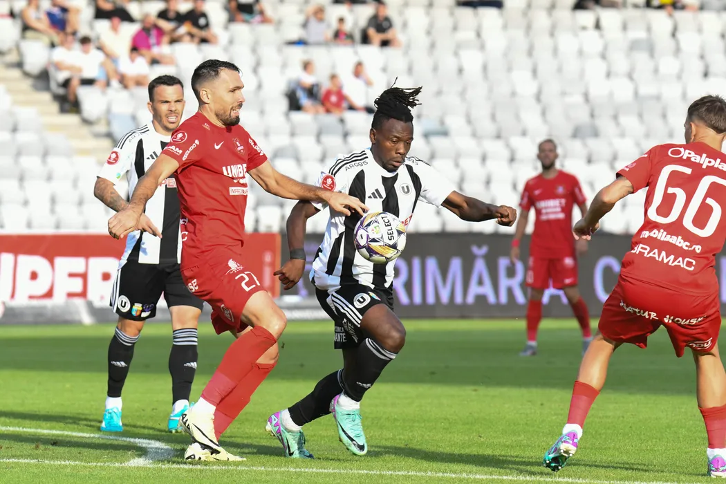 Franck Tchassem și Valerică Marius Găman în meciul de fotbal dintre FC Universitatea Cluj și AFC Hermannstadt contând pentru SUPERLIGA SUPERBET, desfășurat pe Stadionul CLUJ ARENA din Cluj-Napoca, duminică 21 iulie 2024. © FOTO: Flaviu BUBOI/SPORT PICTURES