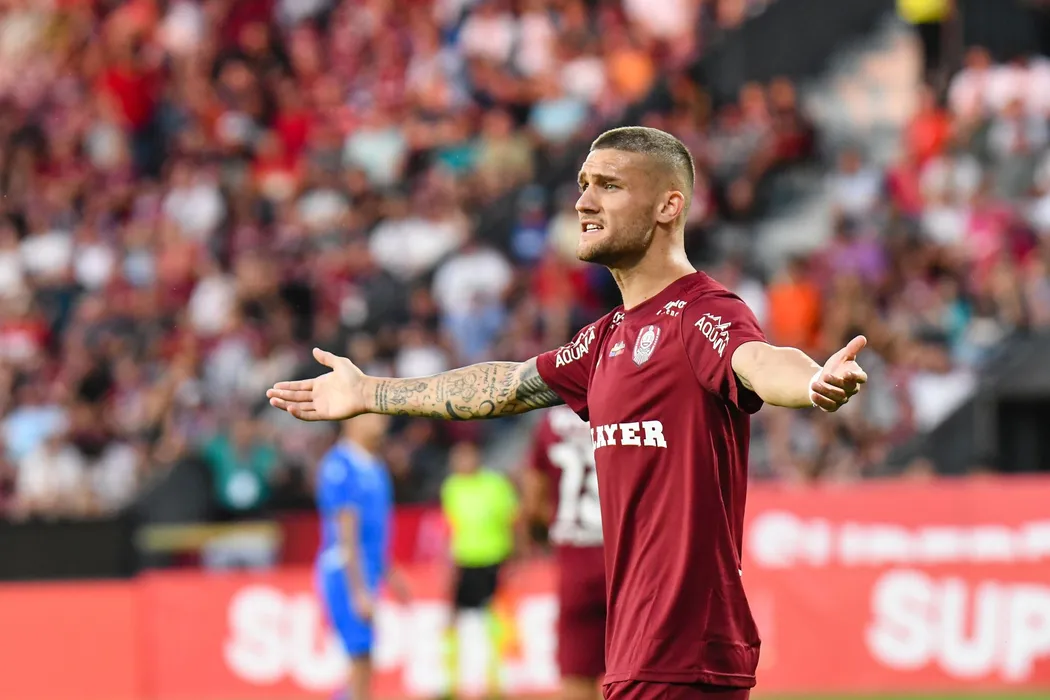 Daniel Birligea is in action during CFR Cluj vs Maccabi Petah Tikva at Dr. Constantin Radulescu Stadium in Cluj-Napoca, Romania, on August 15, 2024.