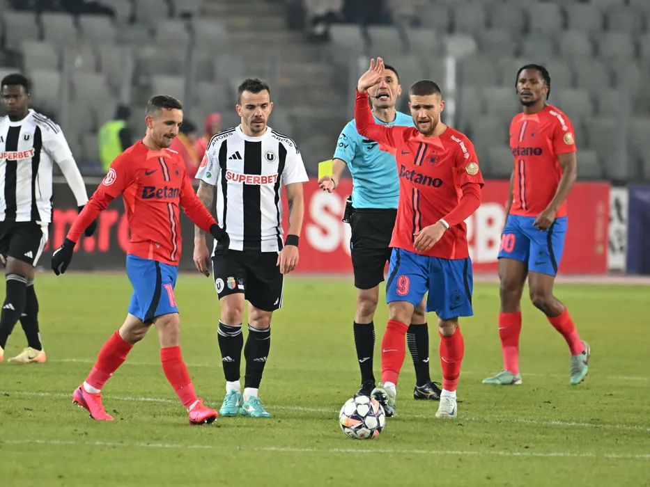 George Daniel Bîrligea reacționează la decizia arbitrului central Marcel Birsan sub privirile lui Marius Ștefănescu, Dan Nicolae Nistor si Siyabonga Ngezana în meciul de fotbal dintre Universitatea Cluj si FCSB, contând pentru Superliga Superbet, desfășurat pe Cluj Arena din Cluj Napoca, duminica 10 noiembrie 2024. © FOTO:Răzvan Pasarica/SPORT PICTURES