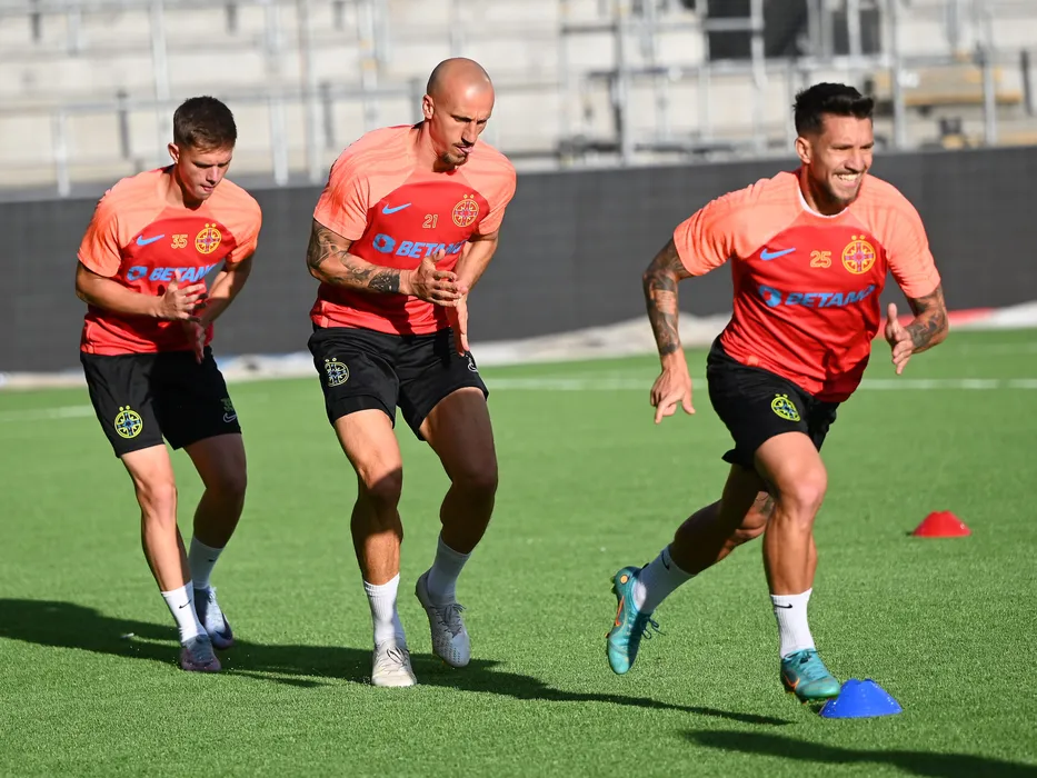 Fotbalistii de la FCSB George Cristian Gogescu, Vlad Iulian Chiriches si Alexandru Mihail Baluta la antrenamentul oficial de dinaintea meciului impotriva lui FC Nordsjælland, din cadrul UEFA Europa Conference League, desfasurat pe Stadionul Right to Dream Park din Farum, miercuri 16 august 2023. © FOTO:Razvan Pasarica/SPORT PICTURES