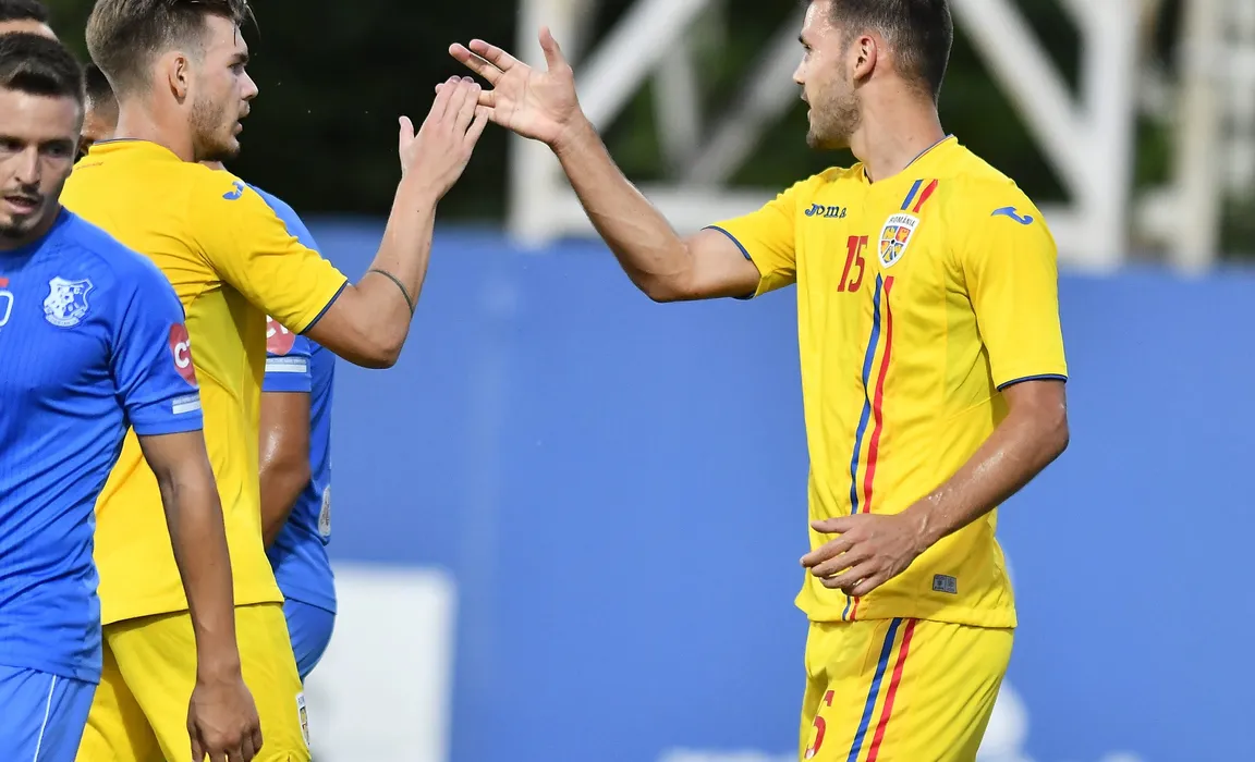 Denis Harut il felicita pe Andrei Chindris dupa un gol marcat in meciul amical de fotbal dintre Romania U21 si Farul Constanta, desfasurat fara spectatori pe terenul central al Centrului National de Fotbal de la Mogosoaia, joi 6 august 2020. © FOTO:Razvan Pasarica/SPORT PICTURES