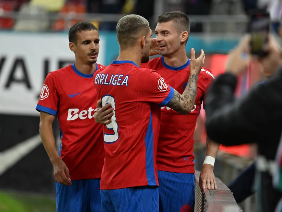 Bucurie a fotbalistilor ros-albastrii Juri Cisotti, George Daniel Bîrligea si Florin Lucian Tănase dupa un gol marcat in meciul dintre FCSB si Otelul Galati, contand pentru Superliga Superbet, desfasurat pe Arena Nationala din Bucuresti, duminica 28 septembrie 2025. © FOTO:Razvan Pasarica/SPORT PICTURES