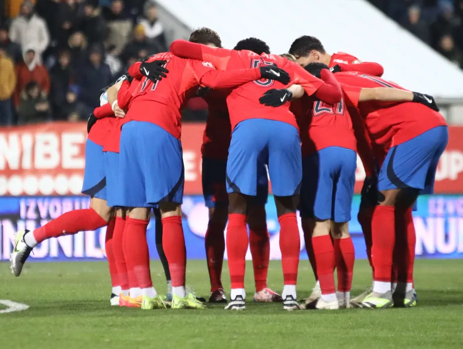 Fotbaliștii roș-albaștrii se încurajează înaintea meciului de fotbal dintre FC Botoșani și FCSB, contând pentru Superliga Superbet, desfășurat pe Stadionul Municipal din Botoșani, joi 21 noiembrie 2024. © FOTO: Ionuț TABULTOC/SPORT PICTURES