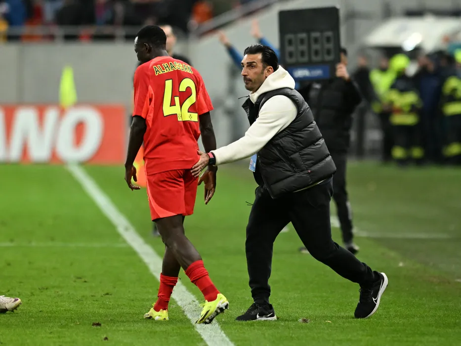Elias Charalambous il incurajeaza pe Baba Alhassan în meciul de fotbal dintre FCSB si Farul Constanta, contând pentru Superliga Superbet, desfășurat pe Arena Nationala din Bucuresti, luni 5 februarie 2024. © FOTO: Răzvan PĂSĂRICĂ/SPORT PICTURES