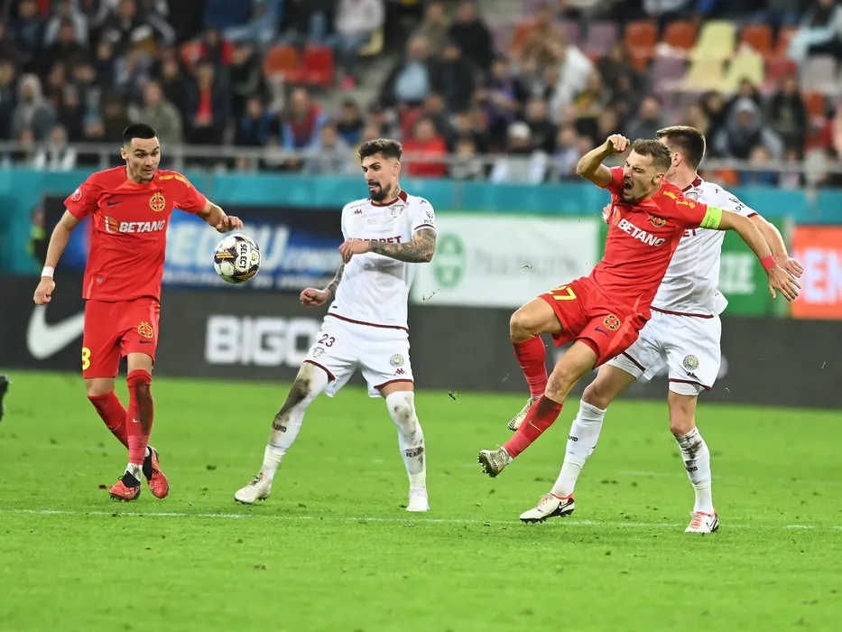 Adrian Gheorghe Sut, Alexandru Cristian Albu si Darius Dumitru Olaru in meciul de fotbal dintre FCSB si Rapid Bucuresti, din cadrul Superligii Superbet, desfasurat pe Arena Nationala din Bucuresti, duminica 5 noiembrie 2023. © FOTO:Razvan Pasarica/SPORT PICTURES