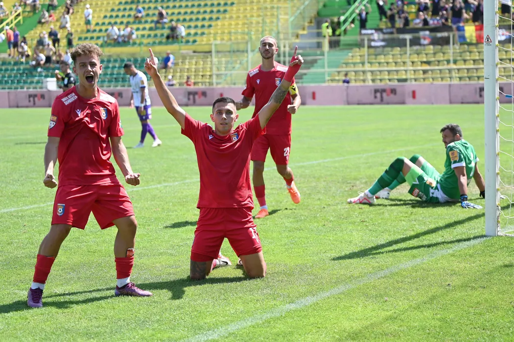 Robert Marian Moldoveanu se bucura dupa un gol marcat alaturi de Luca Petru Manolache in meciul de fotbal dintre FC Arges si Chindia Targoviste, contand pentru Liga a-2-a Casa Pariurilor, desfasurat pe Stadionul Orasenesc din Mioveni, sambata 26 august 2023. © FOTO:Razvan Pasarica/SPORT PICTURES