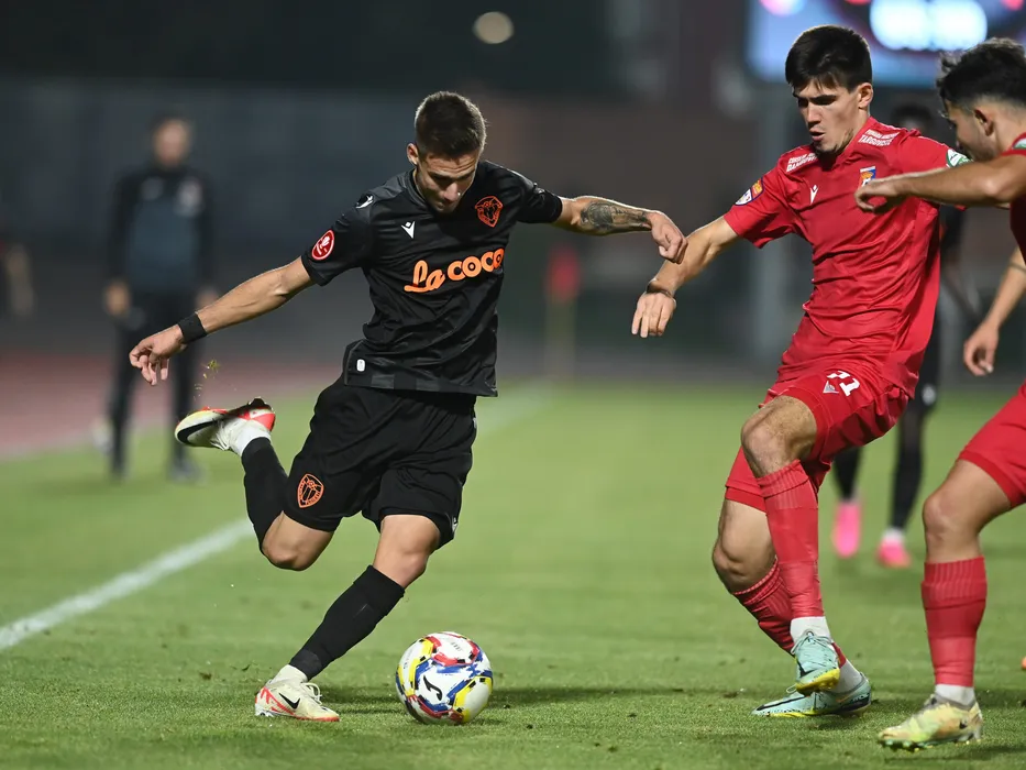 Mihnea Gabriel Radulescu si Luca Petru Manolache in meciul de fotbal dintre Chindia Targoviste si Petrolul Ploiesti, contand pentru Cupa Romaniei Betano, desfasurat pe Stadionul Eugen Popescu din Targoviste, marti 31 octombrie 2023. © FOTO:Razvan Pasarica/SPORT PICTURES