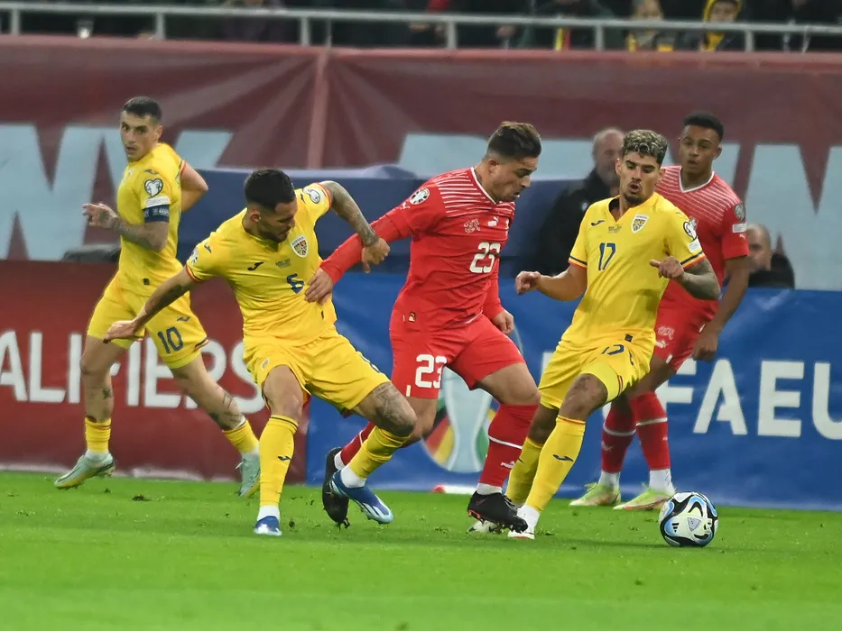 Radu Dragusin,Xherdan Shaqiri si Florinel Coman in meciul de fotbal dintre Romania si Elvetia, din cadrul preliminariilor Campionatului European 2024, desfasurat pe Arena Nationala, marti 21 noiembrie 2023. © FOTO:Razvan Pasarica/SPORT PICTURES