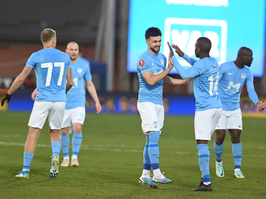 Bucurie a fotbalistilor voluntareni dupa un gol marcat de catre Vitalie Damascan la meciul de fotbal dintre FC Voluntari si FC Hermannstadt, contand pentru Superliga Superbet, desfasurat pe Stadionul Anghel Iordanescu din Voluntari, vineri 17 martie 2023. © FOTO:Razvan Pasarica/SPORT PICTURES