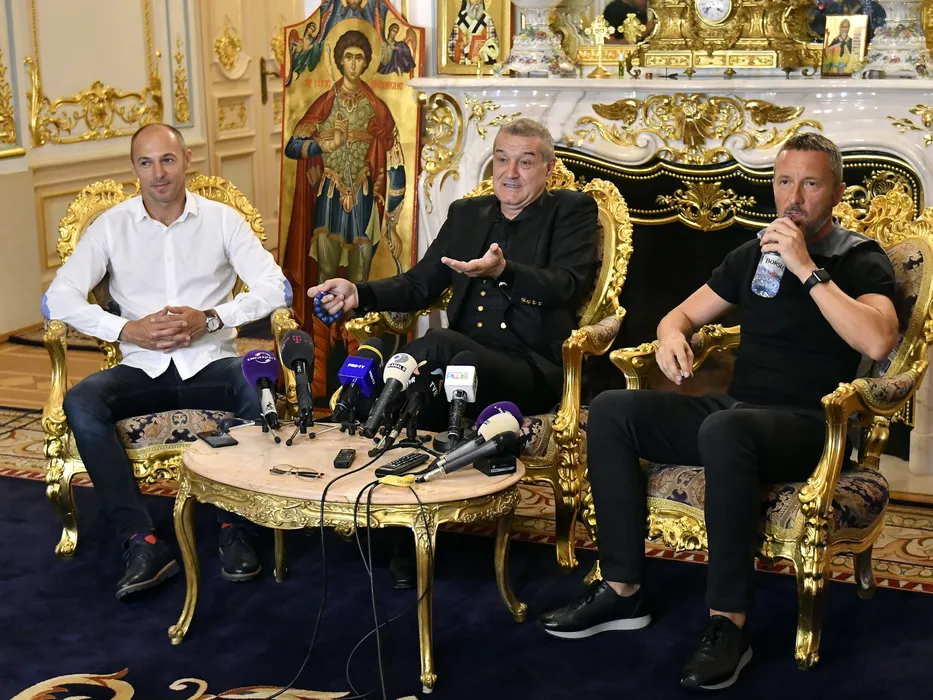 Bogdan Andone,Gigi Becali si Mihai Stoica la conferinta de prezentare a noului antrenor de la FCSB, desfasurata la sediul din Aleea Alexandru din Bucuresti, miercuri 5 iunie 2019. © FOTO:Razvan Pasarica/SPORT PICTURES