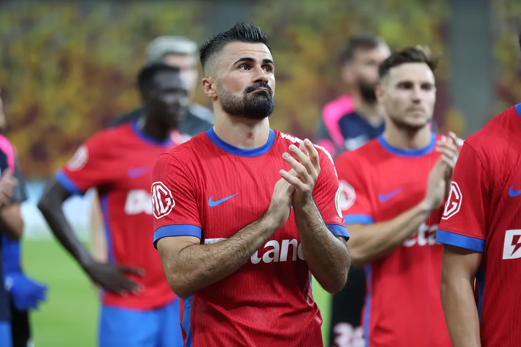 Jucatorii formatiei FCSB reactioneaza la finalul meciului de fotbal contra echipei KF Shkendija din preliminariile Ligii Campionilor, disputat pe Arena Nationala din Bucuresti, miercuri, 30 iulie 2025. FCSB a fost eliminata din Liga Campionilor la fotbal de echipa nord-macedoneana KF Shkendija, care s-a impus cu scorul de 2-1 (1-1).