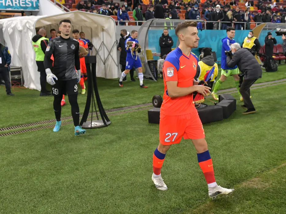 Capitanul stelist Darius Dumitru Olaru iese pe teren la meciul de fotbal dintre FCSB si FC U Craiova, contand pentru Liga 1 Casa Pariurilor, desfasurat pe Arena Nationala din Bucuresti, duminica 6 februarie 2022. © FOTO:Razvan Pasarica/SPORT PICTURES