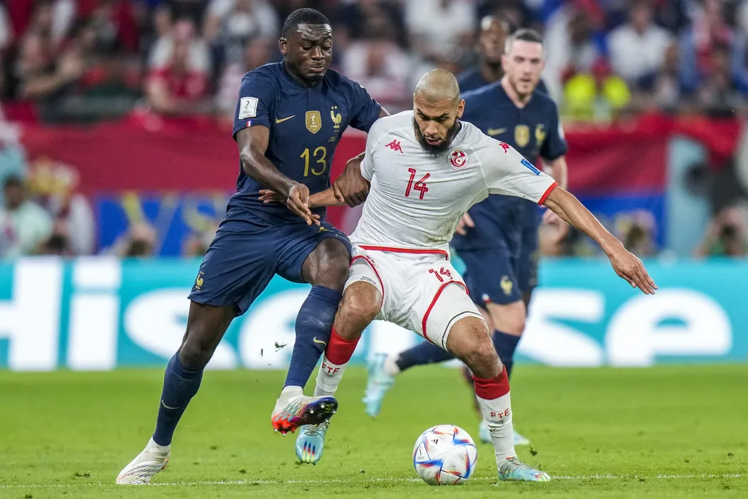 Tunisia's Aissa Laidouni, right, fights for the ball with France's Dayot Upamecano during the World Cup group D soccer match between Tunisia and France at the Education City Stadium in Al Rayyan, Qatar, Wednesday, Nov. 30, 2022. (AP Photo/Alessandra Tarantino)