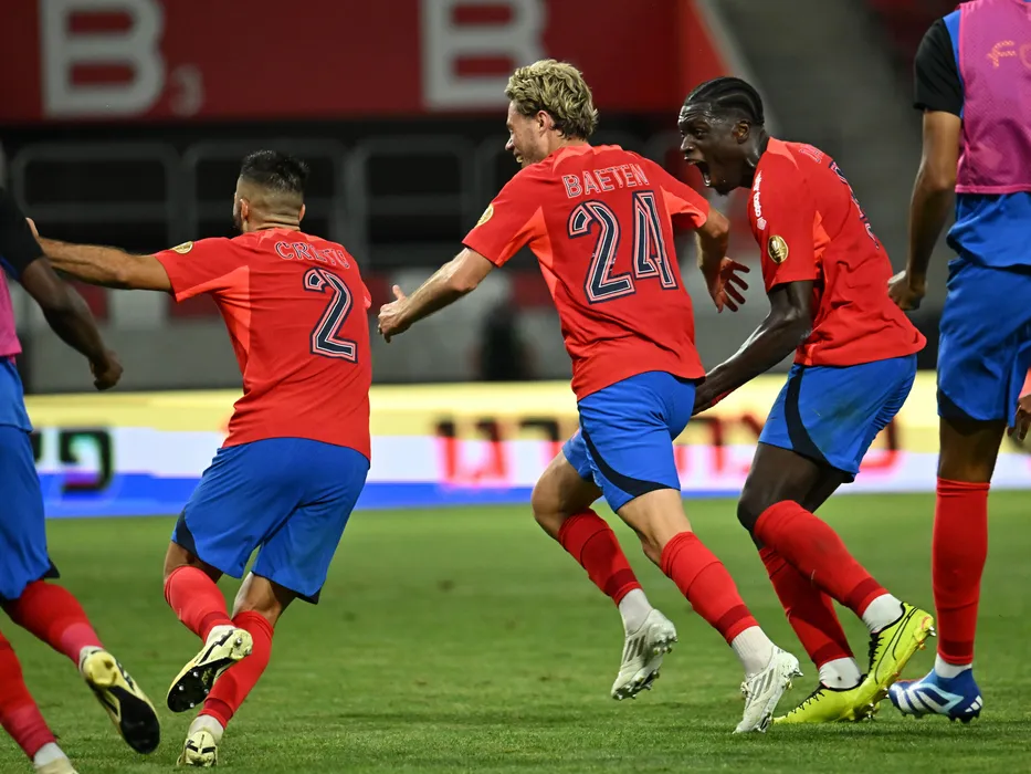 Bucurie a fotbalistilor stelisti Valentin Crețu si Joyskim Aurelien Dawa Tchakonte dupa un gol marcat de catre William Guido R Baeten in meciul dintre Maccabi Tel Aviv FC si FCSB, contand pentru Preliminariile Ligii Campionilor, desfasurat pe Bozsik Arena din Budapesta, miercuri 31 iulie 2024. © FOTO:Razvan Pasarica/SPORT PICTURES