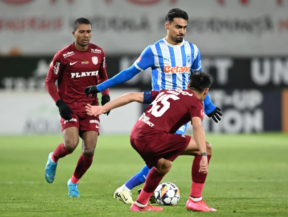 Stefan Baiaram si Mohammed Kesselly Kamara, Mario Camora (Malico Paulino Mario Jorge) in meciul de fotbal dintre FC CFR 1907 Cluj si Universitatea Craiova, contand pentru Superliga Superbet - Play-Off, desfasurat pe Stadionul Dr.Constantin Radulescu din Cluj-Napoca, luni 7 aprilie 2025. © FOTO: Flaviu Buboi/SPORT PICTURES