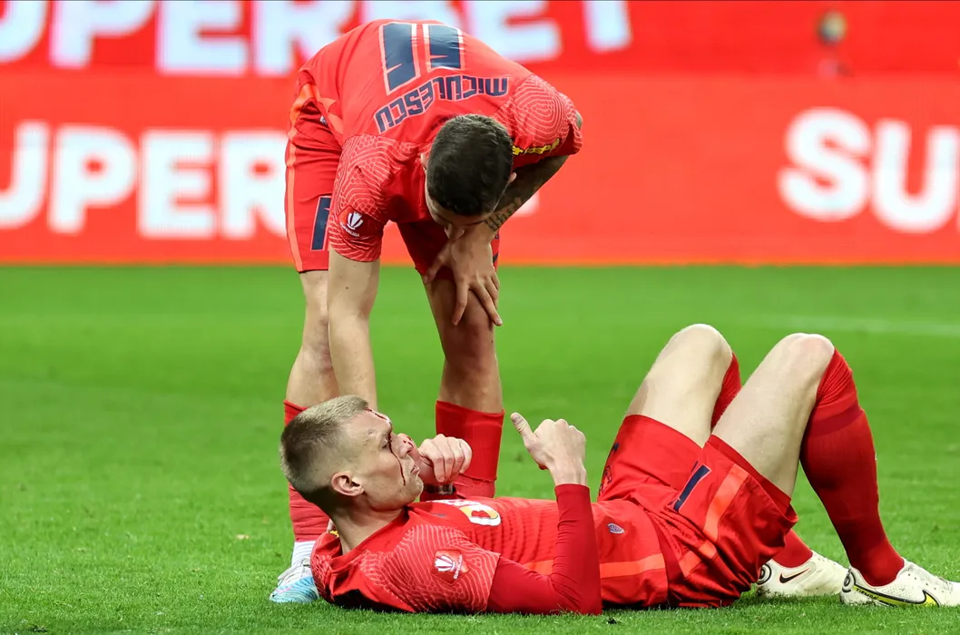 Joonas Tamm (jos), de la FCSB, reactioneaza dupa ce s-a accidentat in timpul meciului de fotbal contra echipei CS Universitatea Craiova din etapa a XXVI-a a Superligii, disputat pe Arena Nationala din Bucuresti, duminica, 19 februarie 2023. GEORGE FILIP/ MEDIAFAX FOTO
