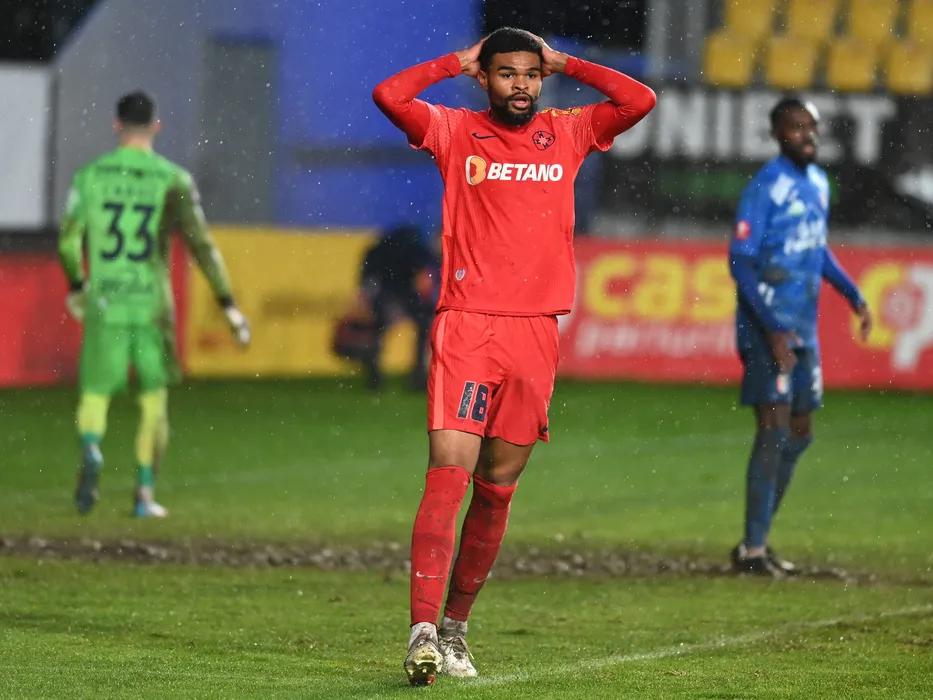 Sylas Laouari Edjouma Malcom isi pune mainile pe cap dupa o ratare avuta in meciul de fotbal dintre Chindia Targoviste si FCSB, contand pentru Superliga Superbet, desfasurat pe Stadionul Ilie Oana din Ploiesti, duminica 11 decembrie 2022. © FOTO:Razvan Pasarica/SPORT PICTURES