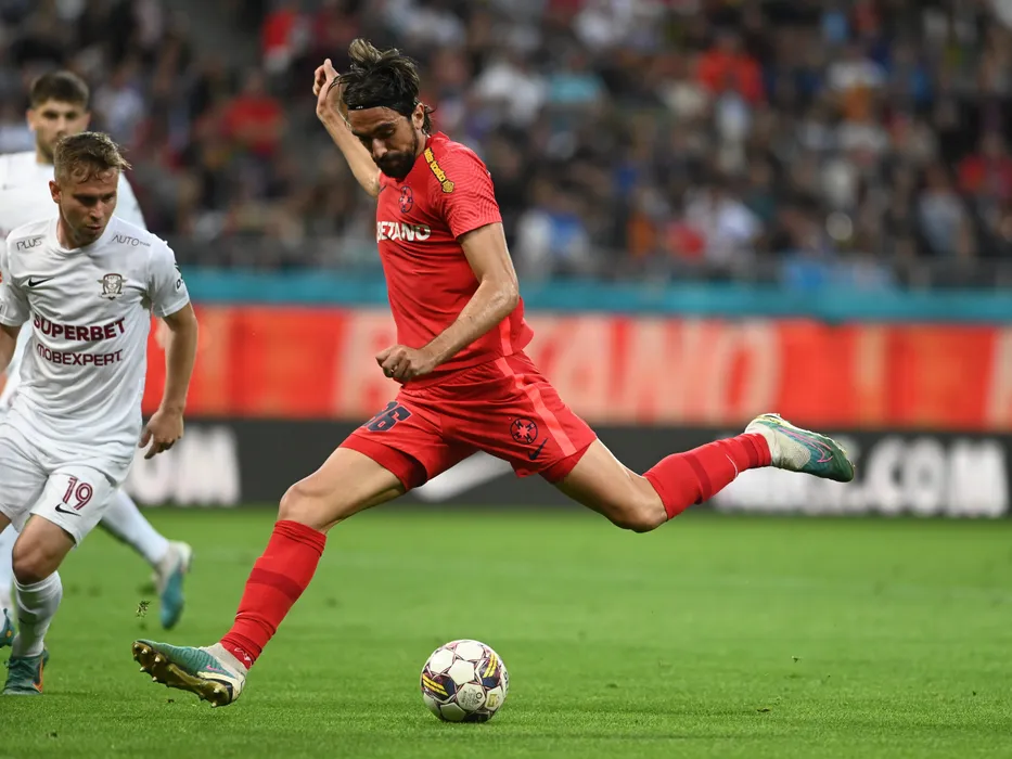 Phillipe Razvan Onea si Andrea Compagno in meciul de fotbal dintre FCSB si Rapid Bucuresti, contand pentru Play-off-ul Superligii Superbet, desfasurat pe Arena Nationala din Bucuresti, sambata 27 mai 2023. © FOTO:Razvan Pasarica/SPORT PICTURES