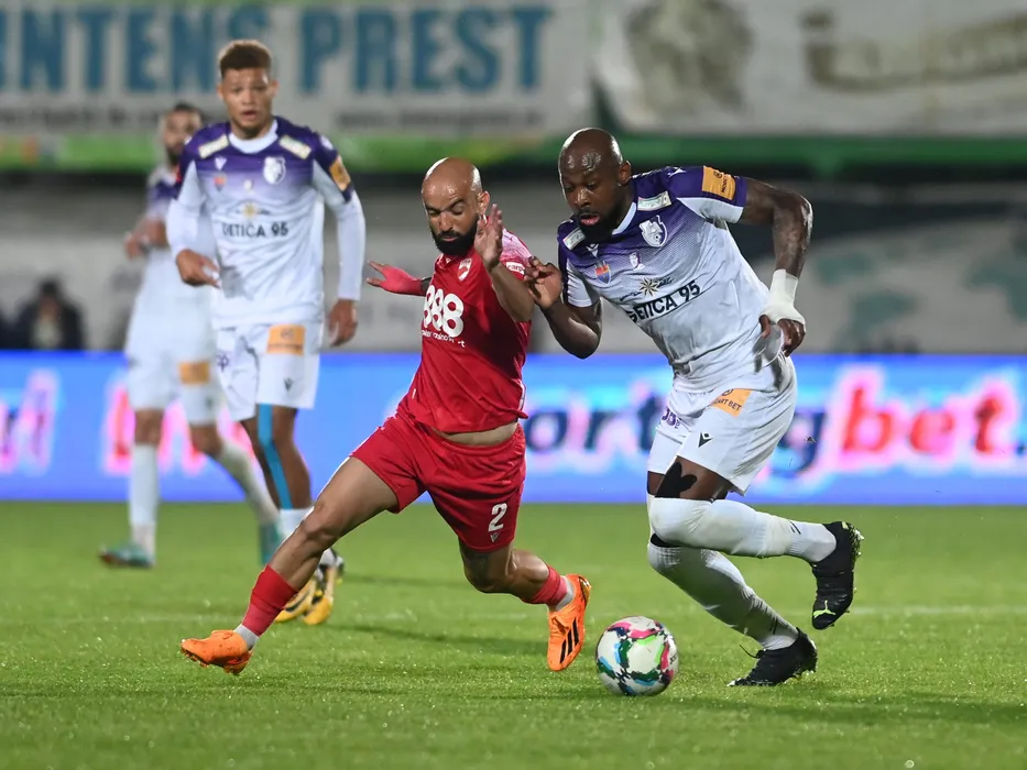 Gabriel Rodrigues De Moura si Paul Arnold Garita in meciul de fotbal dintre FC Arges si Dinamo Bucuresti, contand pentru mansa retur a Barajului pentru mentinerea in Superliga Superbet, desfasurat pe Stadionul Orasenesc din Mioveni, sambata 3 iunie 2023. © FOTO:Razvan Pasarica/SPORT PICTURES