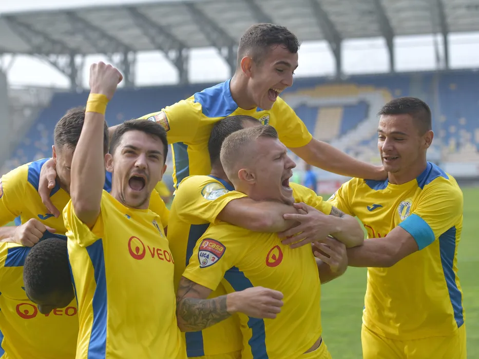 Armando Vajushi se bucura dupa un gol marcat alaturi de Marius Chindris, Valentin Ticu, Sory Ibrahim Diarra, Darius Grazian Buia si Eugeniu Cebotaru in meciul de fotbal dintre Petrolul Ploiesti si Dunarea Calarasi, contand pentru Liga a-2-a Casa Pariurilor, desfasurat pe Stadionul Ilie Oana din Ploiesti, sambata 6 noiembrie 2021. © FOTO:Razvan Pasarica/SPORT PICTURES