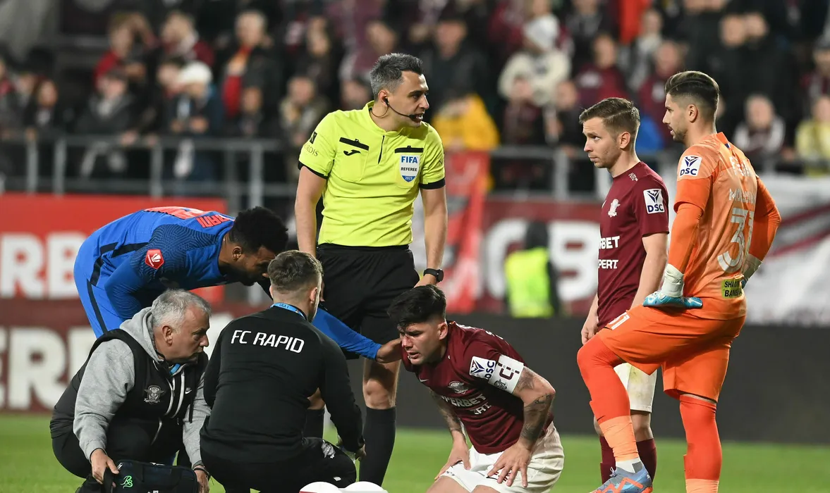 Arbitrul central Horatiu Mircea Fesnic alaturi de Cristian Ionut Sapunaru sangerand la pamant sub privirile lui Andrea Compagno,Phillipe Razvan Onea si Horatiu Alexandru Moldovan in meciul de fotbal dintre Rapid Bucuresti si FCSB, contand pentru Play-off-ul Superligii Superbet, desfasurat pe Stadionul Rapid Giulesti din Bucuresti, duminica 23 aprilie 2023. © FOTO:Razvan Pasarica/SPORT PICTURES
