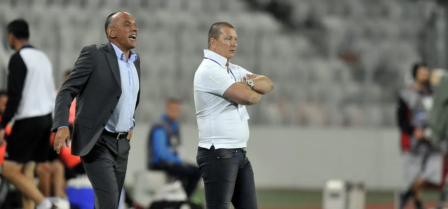 Presedintele clubului CSMS Iasi, Florin Prunea, si antrenorul Ionut Chirila urmaresc meciul cu Universitatea Cluj, din etapa a VI-a a Ligii I, disputat in Cluj-Napoca, luni, 1 septembrie 2014. DAN TAUTAN / MEDIAFAX FOTO