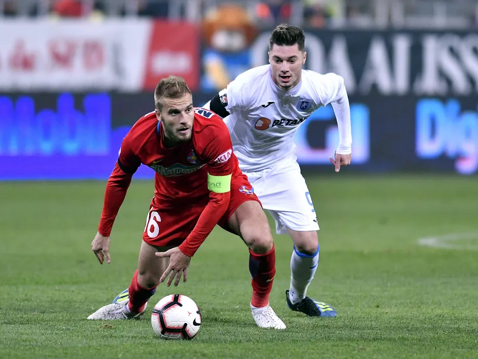 Bogdan Planic si Andrei Burlacu in meciul de fotbal dintre Universitatea Craiova si FCSB, din cadrul Ligii 1 Betano, desfasurat pe Stadionul Ion Oblemenco din Craiova, duminica 21 octombrie 2018. © FOTO Razvan Pasarica/SPORT PICTURES