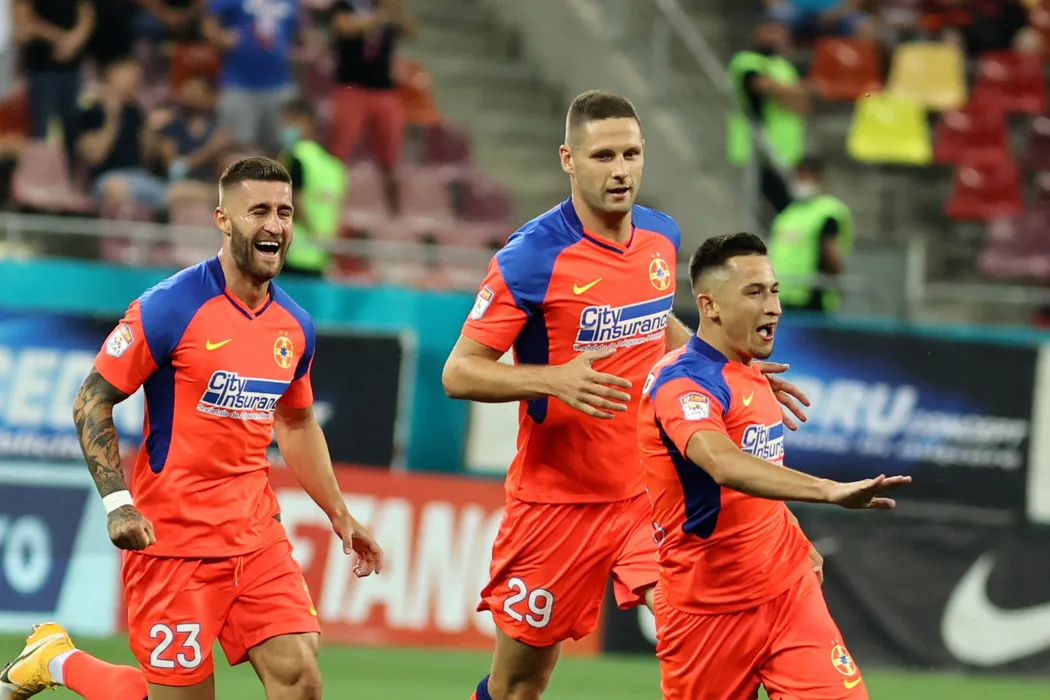 Olimpiu Morutan (D), de la FCSB, reactioneaza dupa inscrierea unui gol in timpul meciului de fotbal contra echipei CS Universitatea Craiova din etapa a II-a a Ligii 1, disputat pe Arena Nationala din Bucuresti, duminica, 25 iulie 2021. GEORGE FILIP / MEDIAFAX FOTO