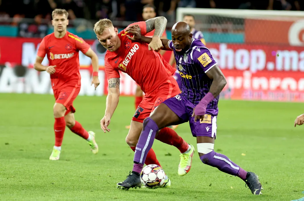 Joonas Tamm (S), de la FCSB, lupta pentru balon cu Paul Garita (D), de la FC Arges, in meciul de fotbal din etapa a XII-a a Superligii, disputat pe Arena Nationala din Bucuresti, duminica, 2 octombrie 2022. GEORGE FILIP / MEDIAFAX FOTO