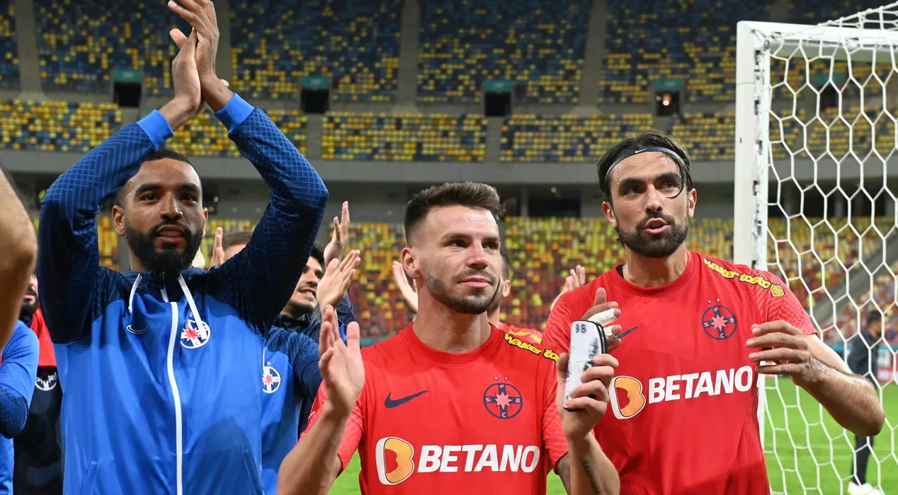 Fotbalistii stelisti Abdel Slem Billel Omrani, Andrei Ioan Cordea si Abdel Slem Billel Omrani saluta galeria dupa meciul de fotbal dintre FCSB si FC Arges, contand pentru Superliga Superbet, desfasurat pe Arena Nationala din Bucuresti, duminica 2 octombrie 2022. © FOTO:Razvan Pasarica/SPORT PICTURES