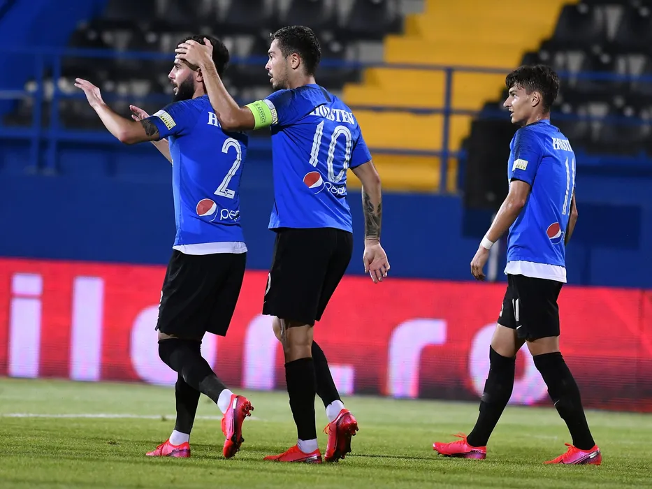 Bucurie a fotbalistilor de la Viitorul cu Radu Stefanita Boboc, Gabriel Cristian Iancu si George Danut Ganea in meciul de fotbal dintre FC Viitorul si AFC Hermannstadt, contand pentru play-out-ul Ligii 1 Casa Pariurilor, disputat fara spectatori pe Arena centrala a Academiei Gheorghe Hagi din Ovidiu, luni 22 iunie 2020. © FOTO:Razvan Pasarica/SPORT PICTURES