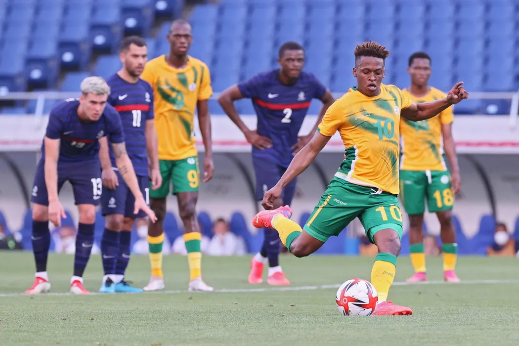 South Africa's forward Luther Singh (R) steps up to take a penalty during the Tokyo 2020 Olympic Games men's group A first round football match between France and South Africa at Saitama Stadium in Saitama on July 25, 2021.,Image: 623215764, License: Rights-managed, Restrictions: , Model Release: no