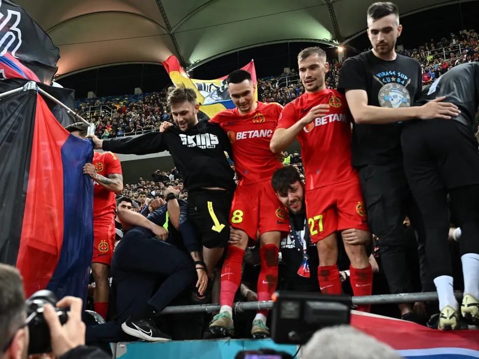 Fotbalistii stelisti Adrian Gheorghe Șut si Darius Dumitru Olaru se bucura alături de galerie dupa castigarea campionatului in urma meciului de fotbal dintre FCSB si Farul Constanta, contând pentru Play off-ul Superligii Superbet, desfășurat pe Arena Nationala din Bucuresti, sambata 27 aprilie 2024.,Image: 868577431, License: Rights-managed, Restrictions: , Model Release: no