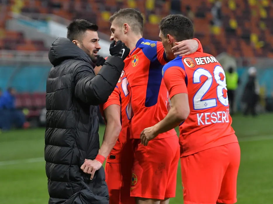 Valentin Gheorghe se bucura dupa un gol marcat alaturi de Valentin Cretu si Claudiu Andrei Keseru in meciul de fotbal dintre FCSB si Chindia Targoviste, contand pentru Liga 1 Casa Pariurilor, desfasurat pe Arena Nationala din Bucuresti, duminica 13 februarie 2022. © FOTO:Razvan Pasarica/SPORT PICTURES