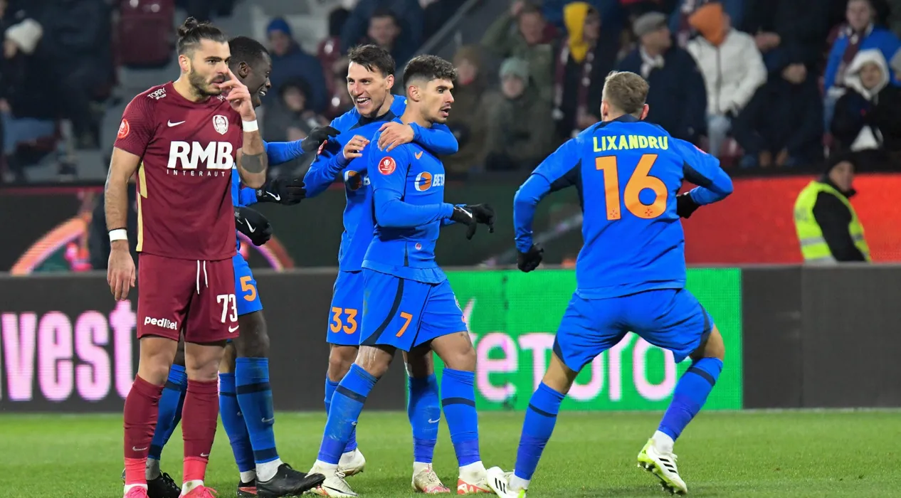Florinel Teodor Coman felicitat de Risto Radunovic pentru golul care a fost anulat de arbitru pentru un presupus fault în meciul de fotbal dintre FC CFR 1907 Cluj SA si FC Fotbal Club FCSB SA, contând pentru Superliga Superbet, desfășurat pe Stadionul Dr.Constantin Rădulescu din Cluj-Napoca, duminică 10 decembrie 2023. © FOTO: Flaviu BUBOI/SPORT PICTURES