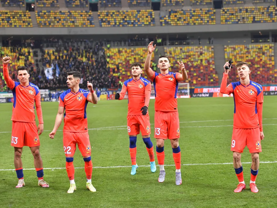 Fotbalistii stelisti Risto Radunovic, Valentin Gheorghe, Ianis Ilie Stoica, Ioan Andrei Vasile Dumiter si Octavian George Popescu saluta galeria dupa meciul de fotbal dintre FCSB si FC U Craiova, contand pentru Liga 1 Casa Pariurilor, desfasurat pe Arena Nationala din Bucuresti, duminica 6 februarie 2022. © FOTO:Razvan Pasarica/SPORT PICTURES