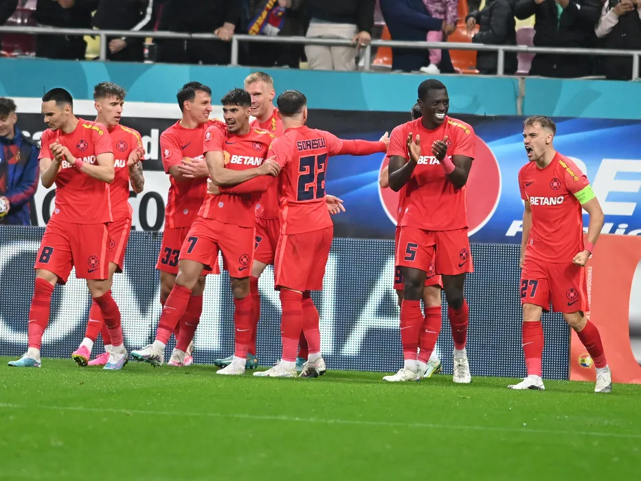 Bucurie a fotbalistilor stelisti dupa un gol marcat cu Adrian Gheorghe Sut, Risto Radunovic, Joonas Tamm, Octavian George Popescu, Florinel Teodor Coman, Joyskim Aurelien Dawa Tchakonte si Darius Dumitru Olaru in meciul de fotbal dintre FCSB si Sepsi OSK Sfantu Gheorghe, contand pentru Play-off-ul Superligii Superbet, desfasurat pe Arena Nationala din Bucuresti, luni 8 mai 2023. © FOTO:Razvan Pasarica/SPORT PICTURES