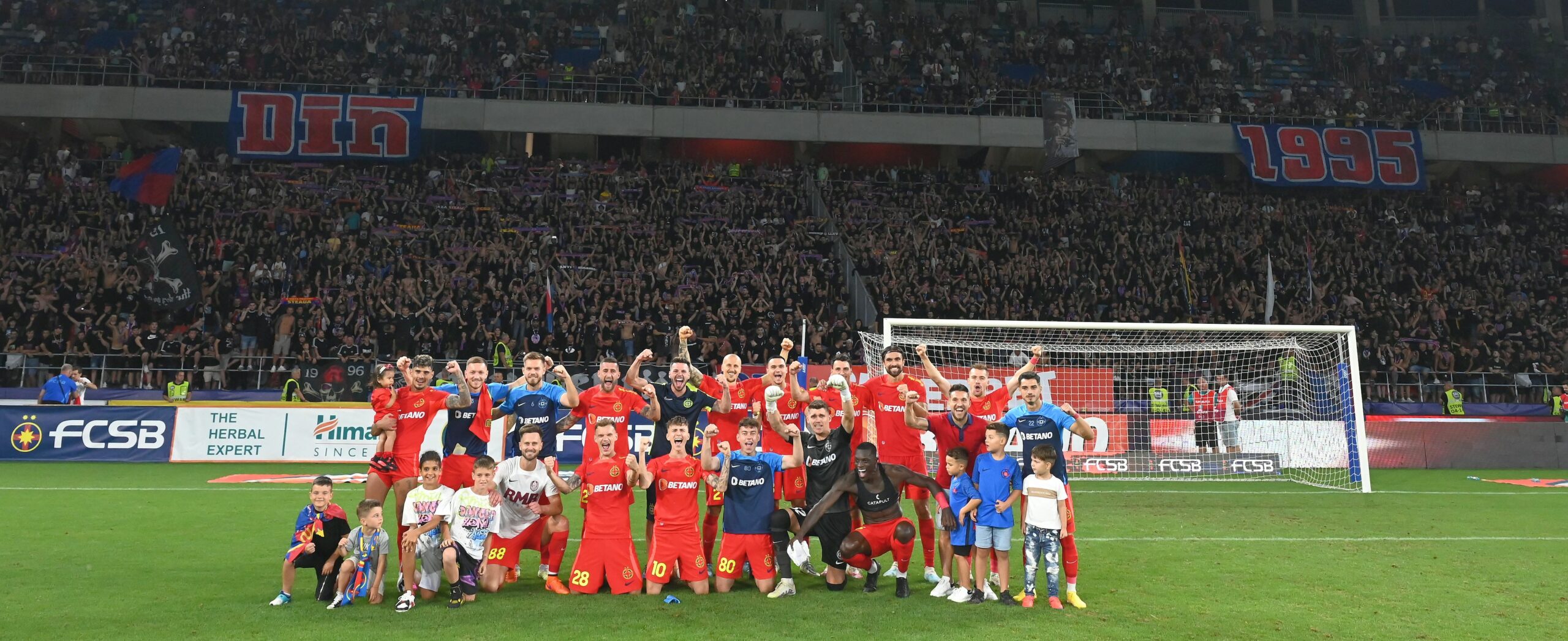 Fotbalistii stelisti pozeaza alaturi de galeria Peluza Nord si tebela de marcaj dupa meciul de fotbal dintre FCSB si CFR Cluj, din cadrul Superligii Superbet, desfasurat pe Stadionul Steaua-Ghencea din Bucuresti, duminica 6 august 2023. © FOTO:Razvan Pasarica/SPORT PICTURES