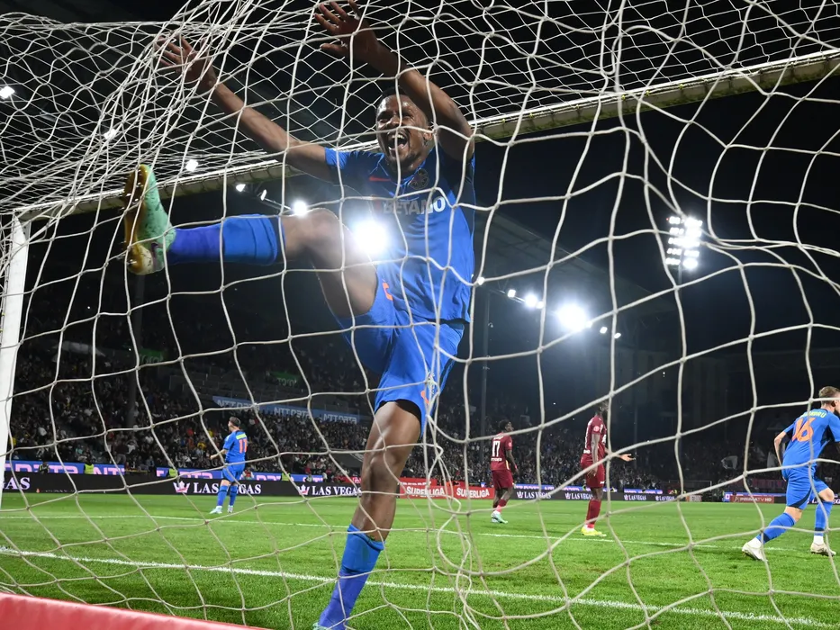 Siyabonga Ngezana se bucura dupa un gol stelist reusit de catre Florinel Teodor Coman în meciul de fotbal dintre CFR Cluj si FCSB, contând pentru Play off-ul Superligii Superbet, desfășurat pe Stadionul Dr. Constantin Raduescu din Cluj Napoca, duminica 14 aprilie 2024. © FOTO: Răzvan Pasarica/SPORT PICTURES