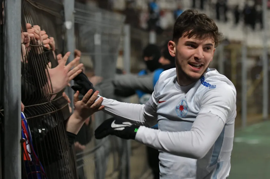 Ianis Ilie Stoica se bucura dupa un gol marcat alaturi de suporterii stelisti prezenti la meciul de fotbal dintre Dinamo Bucuresti si FCSB contand pentru Liga 1 Casa Pariurilor, desfasurat pe Stadionul Dinamo din Bucuresti, duminica 30 ianuarie 2022. © FOTO:Razvan Pasarica/SPORT PICTURES