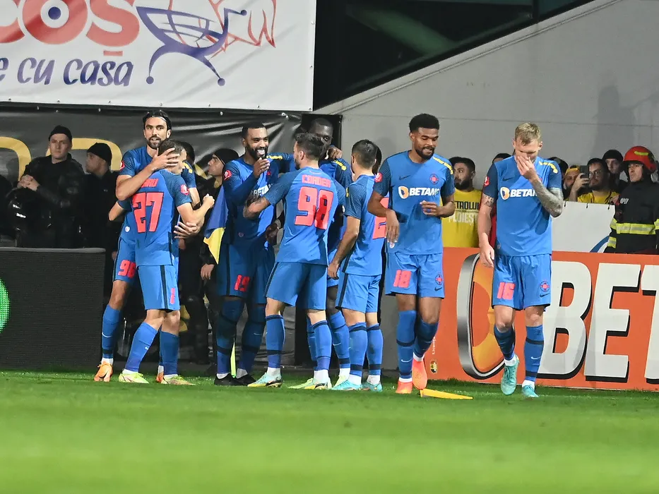 Bucurie a fotbalistilor stelisti dupa un gol marcat cu Andrea Compagno, Abdel Slem Billel Omrani si Sylas Laouari Edjouma Malcom in meciul de fotbal dintre Petrolul Ploiesti si FCSB, contand pentru Superliga Superbet, desfasurat pe Stadionul Ilie Oana din Ploiesti, duminica 9 octombrie 2022. © FOTO:Razvan Pasarica/SPORT PICTURES