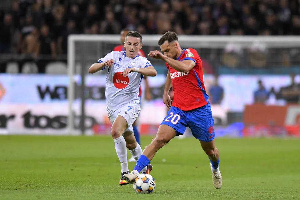 FCSB (echipament rosu-albastru) si Drita (Kosovo) s-au intalnit intr-o partida din turul 3 preliminar al Europa League, joi, 7 august 2025, pe Arena Nationala din Bucuresti. ALEXANDRU DOBRE / MEDIAFAX FOTO