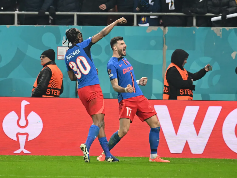 Fotbaliștii ros-albastrii Siyabonga Ngezana si Mihai Popescu se bucură după un gol marcat meciul de fotbal dintre FCSB si PAOK Salonic, din cadrul UEFA Europa League, desfasurat pe Arena Nationala din Bucuresti, joi 20 februarie 2025. © FOTO:Razvan Pasarica/SPORT PICTURES