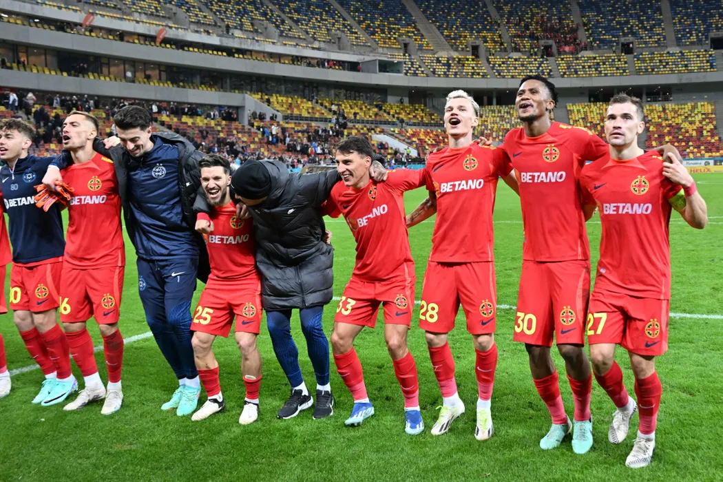Fotbalistii stelisti Eduard Gabriel Radaslavescu, Mihai Daniel Lixandru, Andrei Daniel Vlad, Alexandru Mihail Baluță, Florinel Teodor Coman, Risto Radunovic, Grigoraș Alexandru Pantea, Siyabonga Ngezana si Darius Dumitru Olaru saluta galeria dupa meciul de fotbal dintre FCSB si Sepsi OSK Sfantu Gheorghe, contând pentru Superliga Superbet, desfășurat pe Arena Nationala din Bucuresti, duminica 11 februarie 2024. © FOTO: Răzvan PĂSĂRICĂ/SPORT PICTURES