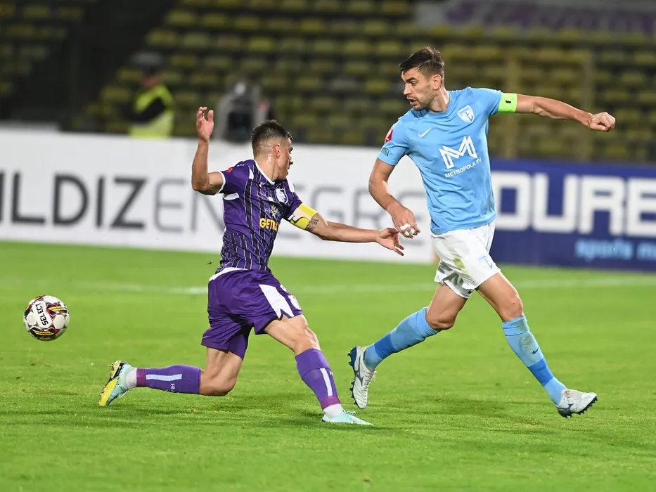 Costinel Andrei Tofan si Igor Armas in meciul de fotbal dintre FC Arges si FC Voluntari, contand pentru Superliga Superbet, desfasurat pe Stadionul Nicolae Dobrin din Pitesti, vineri 14 octombrie 2022. © FOTO:Razvan Pasarica/SPORT PICTURES