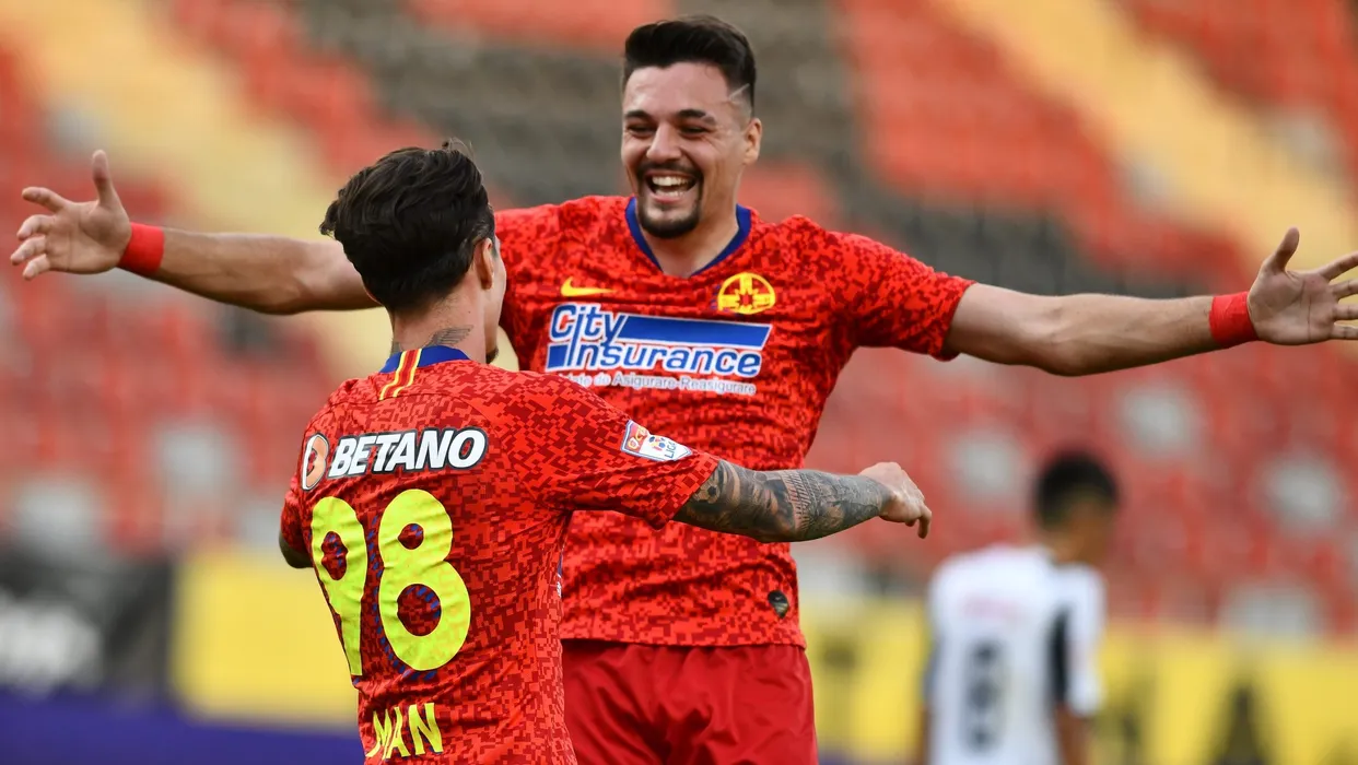 Dennis Man se bucura alaturi de Adrian Petre dupa un gol marcat in meciul de fotbal dintre Astra Giurgiu si FCSB, contand pentru play-off-ul Ligii 1 Casa Pariurilor, disputat fara spectatori pe Stadionul Marin Anastasovici din Giurgiu, luni 29 iunie 2020. © FOTO:Razvan Pasarica/SPORT PICTURES
