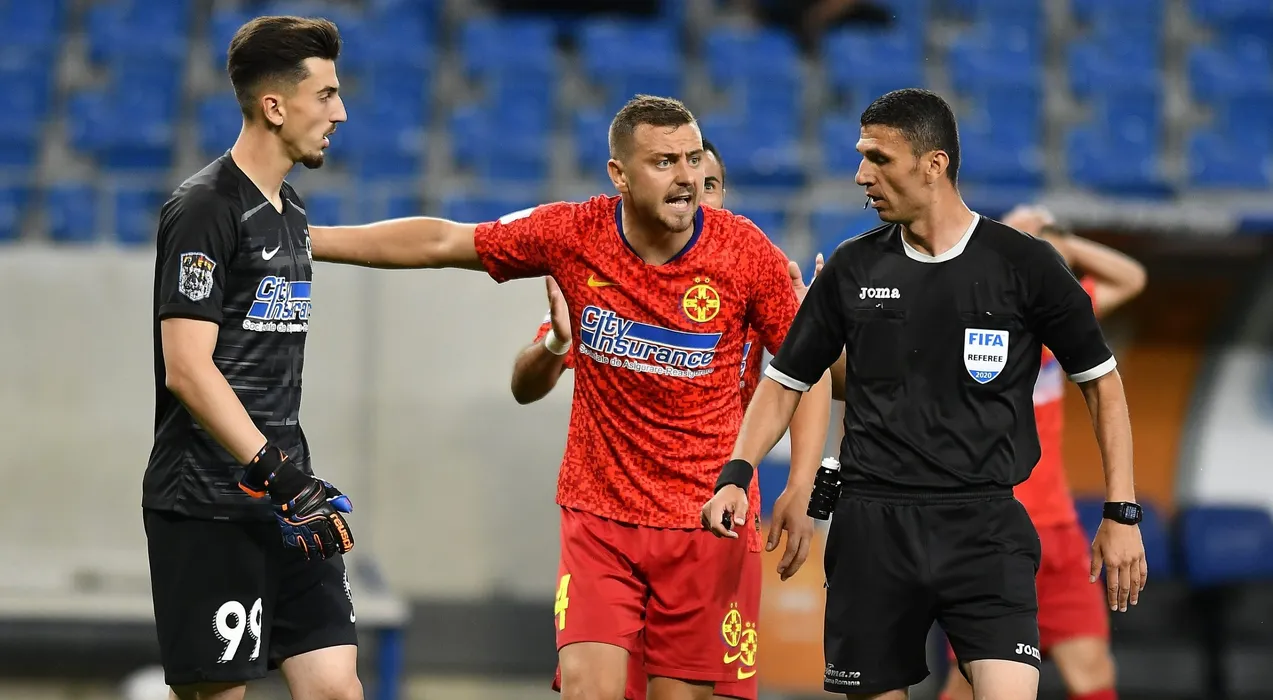 Andrei Daniel Vlad si George Andrei Miron protesteaza la adresa arbitrului central Marcel Barsan in meciul de fotbal dintre Universitatea Craiova si FCSB, contand pentru play-off-ul Ligii 1 Casa Pariurilor, disputat fara spectatori pe Stadionul Ion Oblemenco din Craiova, duminica 12 iulie 2020. © FOTO:Razvan Pasarica/SPORT PICTURES