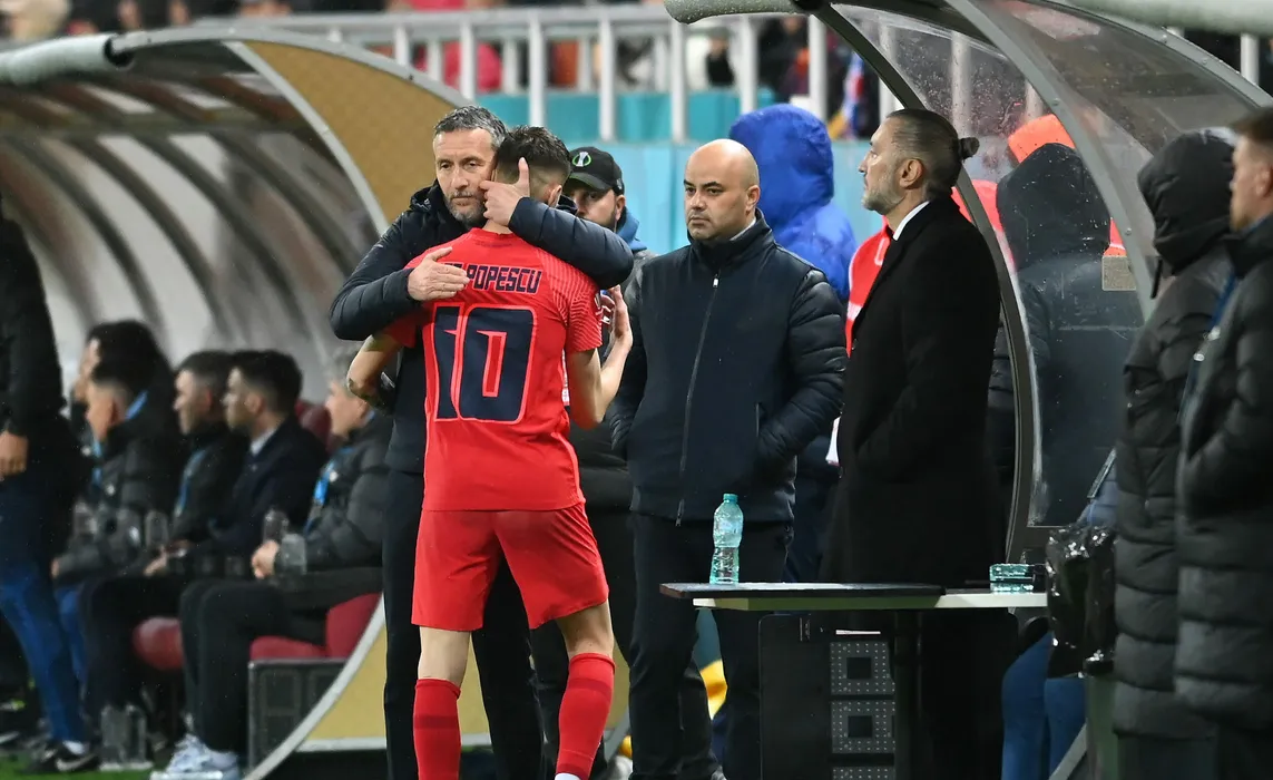 Mihai Stoica il felicita pe Octavian George Popescu la iesirea de pe teren din meciul de fotbal dintre FCSB si Farul Constanta, contand pentru Play-off-ul Superligii Superbet, desfasurat pe Arena Nationala din Bucuresti, luni 17 aprilie 2023. © FOTO:Razvan Pasarica/SPORT PICTURES