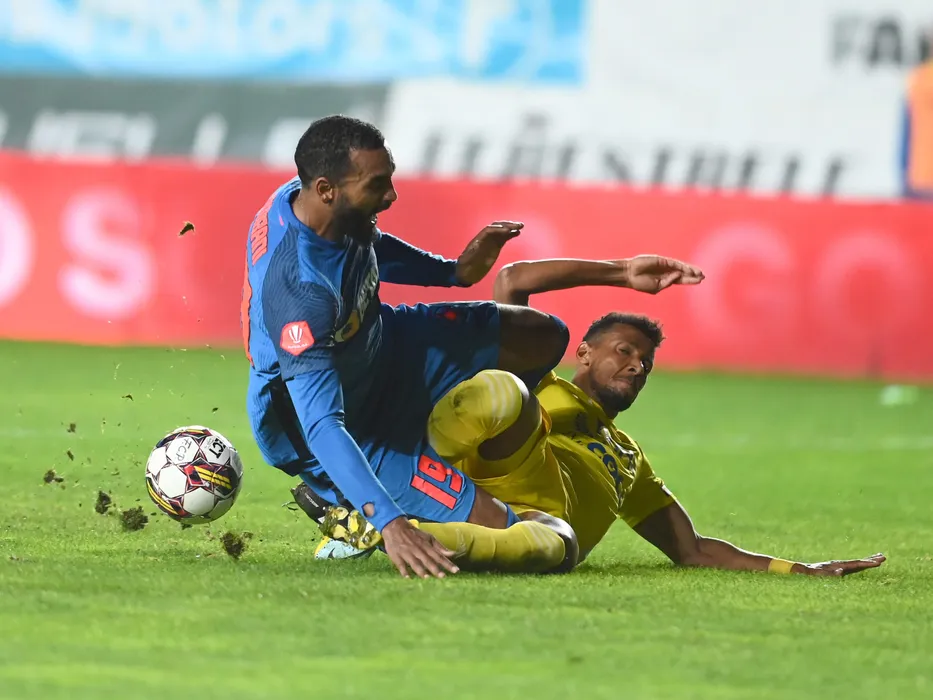 Abdel Slem Billel Omrani si Georgi Velikov Pashov in meciul de fotbal dintre Petrolul Ploiesti si FCSB, contand pentru Superliga Superbet, desfasurat pe Stadionul Ilie Oana din Ploiesti, duminica 9 octombrie 2022. © FOTO:Razvan Pasarica/SPORT PICTURES
